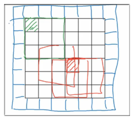 由卷积的计算方法可知,图像边缘特征计算次数显然少于图像中间位置的像素点,如下图示 (绿色的位置明显是冷宫), 图像边缘的大部分信息都丢失了.
